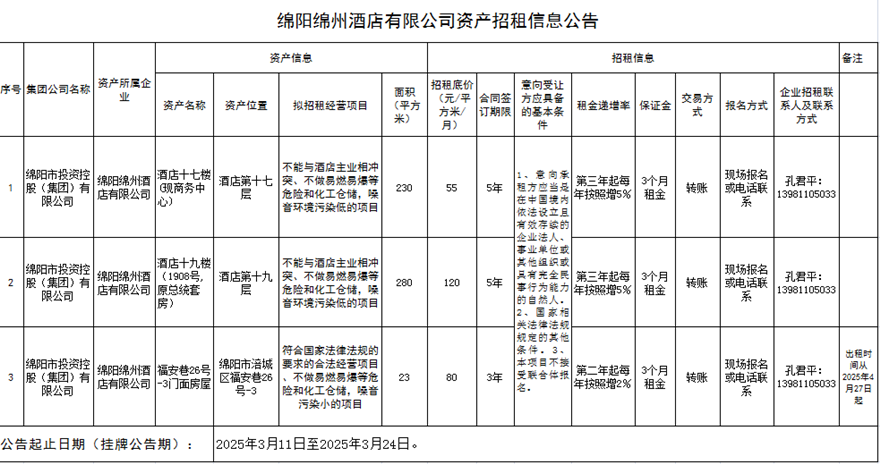 綿陽綿州酒店有限公司資產(chǎn)招租信息公告