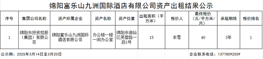 綿陽富樂山九洲國際酒店有限公司資產(chǎn)出租結(jié)果公示