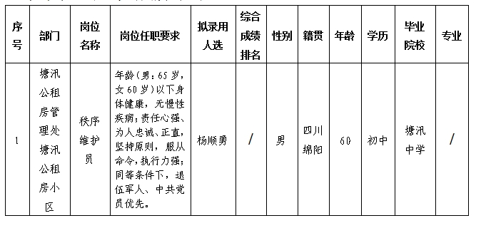 根據(jù)康居公司發(fā)布的長期招聘一線勤雜人員的招聘公告相關規(guī)定,經(jīng)面試、體檢等程序,擬錄用楊順勇同志到綿陽市康居房產(chǎn)經(jīng)營管理有限公司塘汛公租房管理處塘汛公租房小區(qū)工作,現(xiàn)予以公示,具體情況如下: